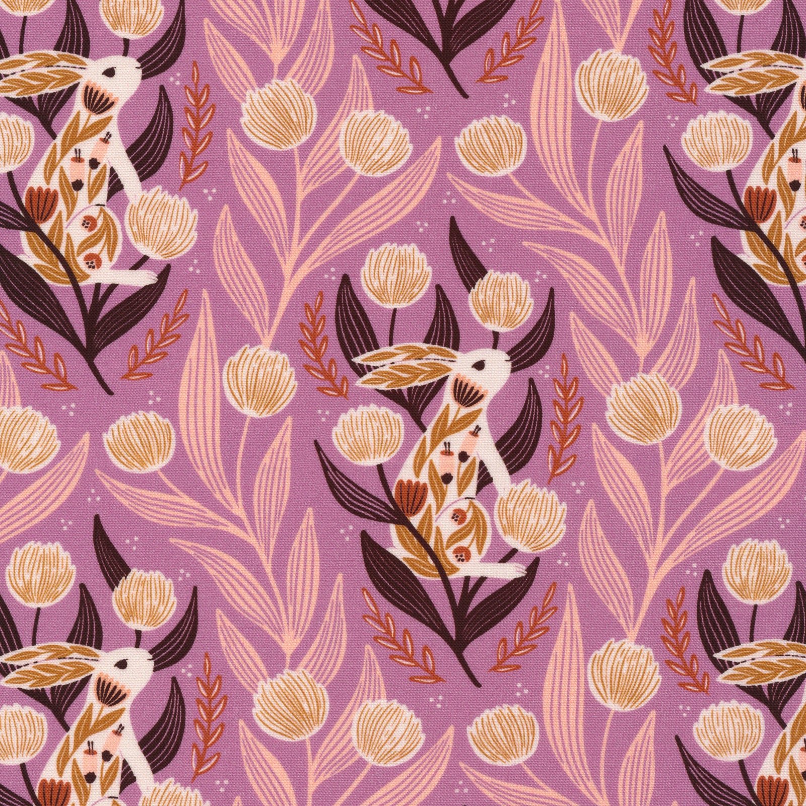 Thickets fabric from the Blooming Revelry collection by Juliana Tipton for Cloud9 Fabrics. Purple pink fabric featuring rabbits and flowers.