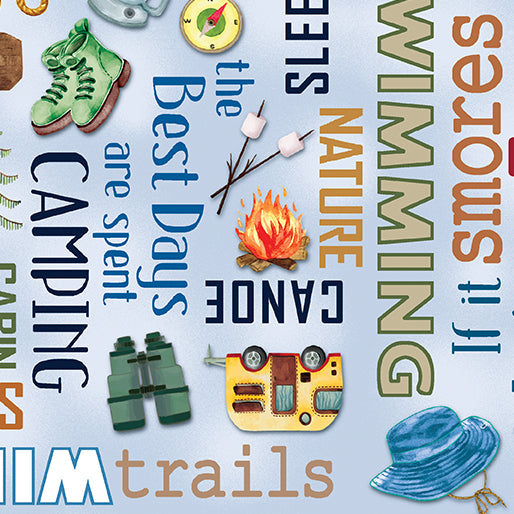 Camping Words fabric in blue from the Live, Love, Camp collection by Nicole DeCamp for Benartex.