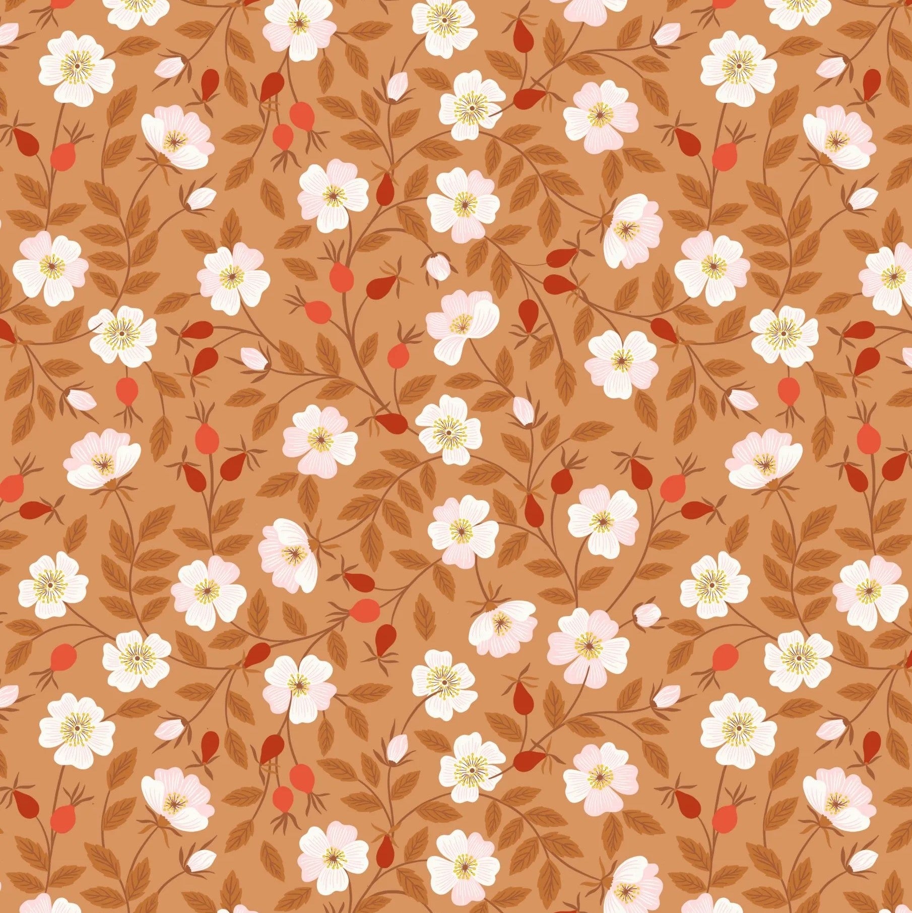 Dog Rose on rust fabric from the Evergreen collection from Lewis & Irene.