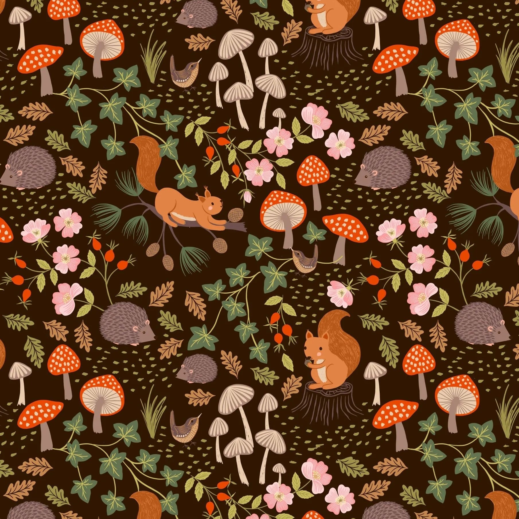 Squirrels and Hedgehogs on brown fabric from the Evergreen collection from Lewis & Irene.
