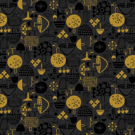 Omatsuri Nakama Kinoko Ippai fabric in black unbleached metallic from the Nightfall collection from Cotton + Steel.
