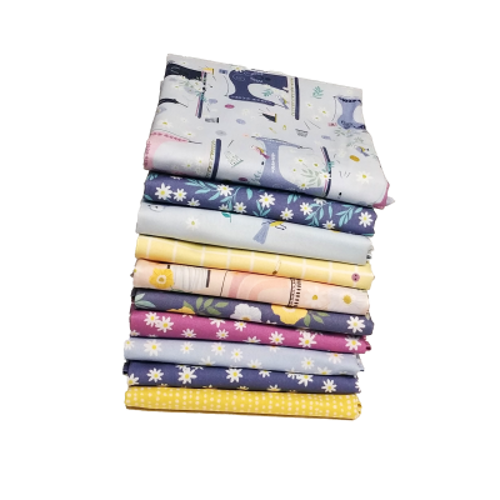 This bundle includes 10 fabrics, 9 prints from the collection and Moonscape in banana. Each piece of fabric measures 20" x 44".
