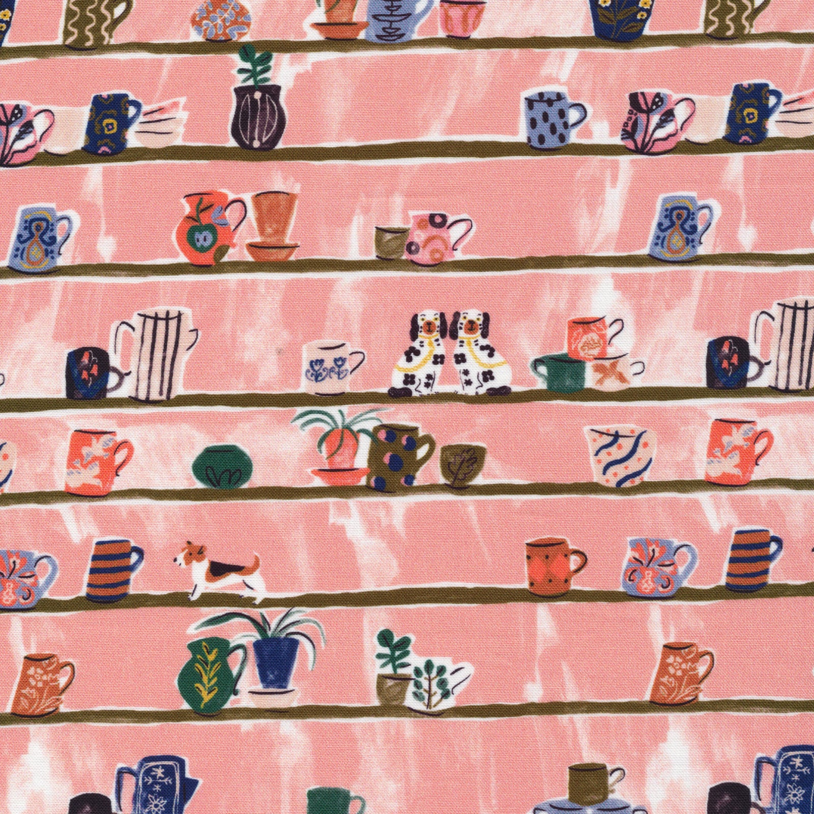 The Sanctuary collection celebrates the preciousness of possessions, nature, and the concept of home with fabrics featuring books, plants, flowers, cats and dogs.