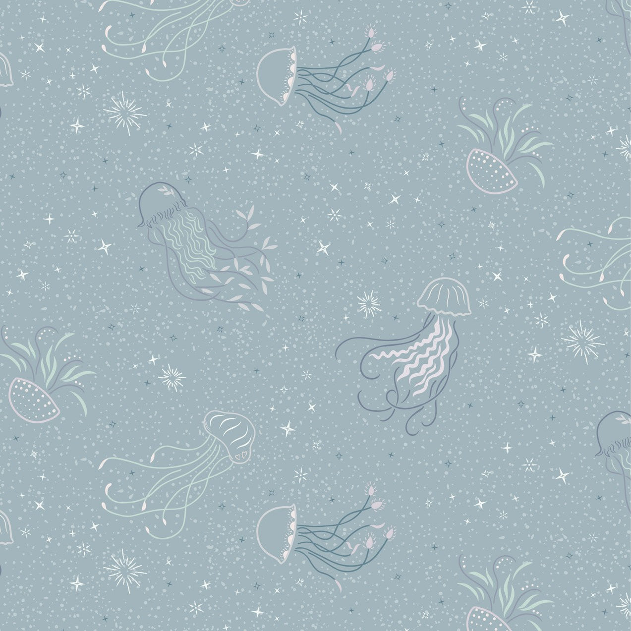 Jellyfish Dance fabric on dusky turquoise from the Sound of the Sea collection by Cassandra Connolly from Lewis & Irene.