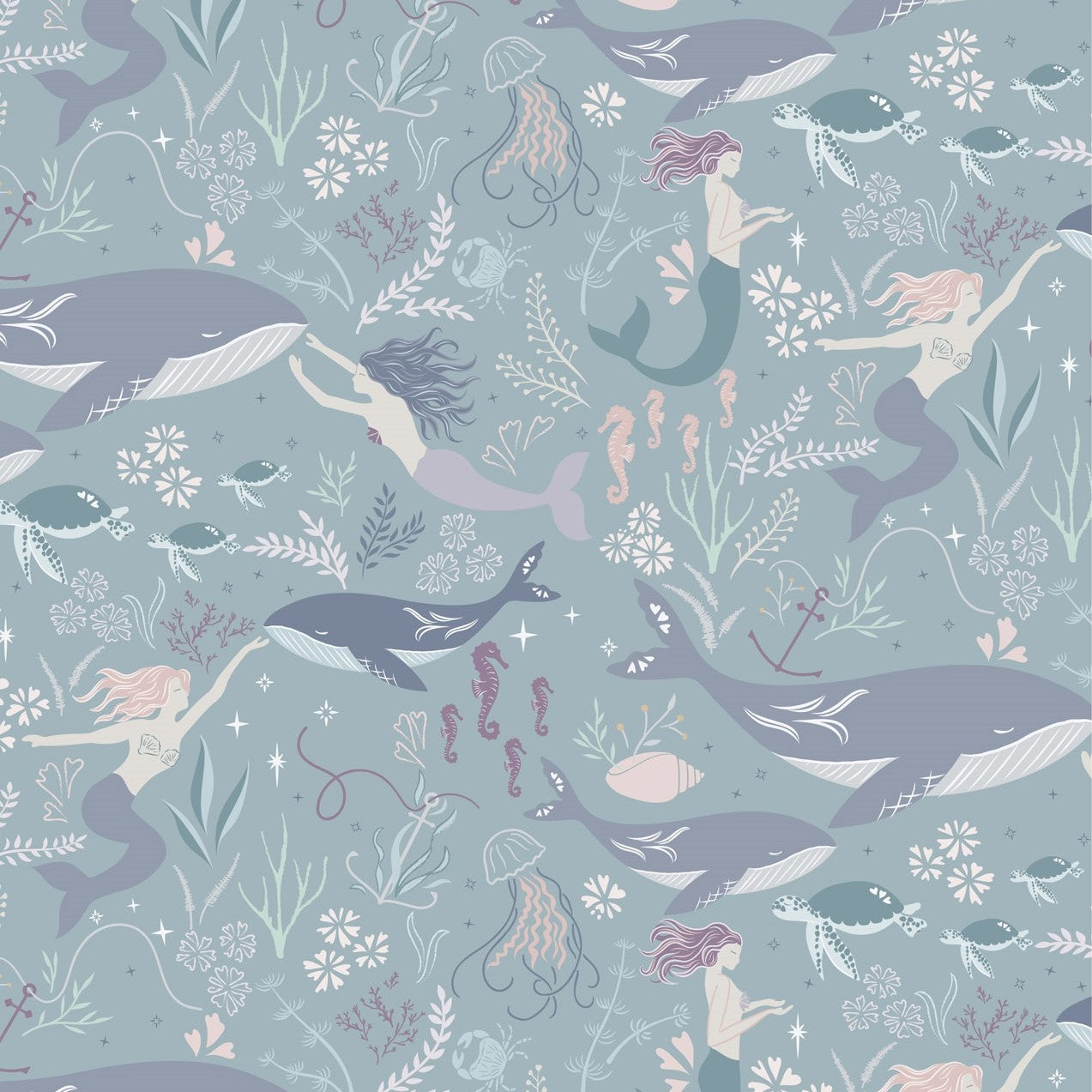 Sirens Spell fabric on dusky turquoise from the Sound of the Sea collection by Cassandra Connolly from Lewis & Irene.