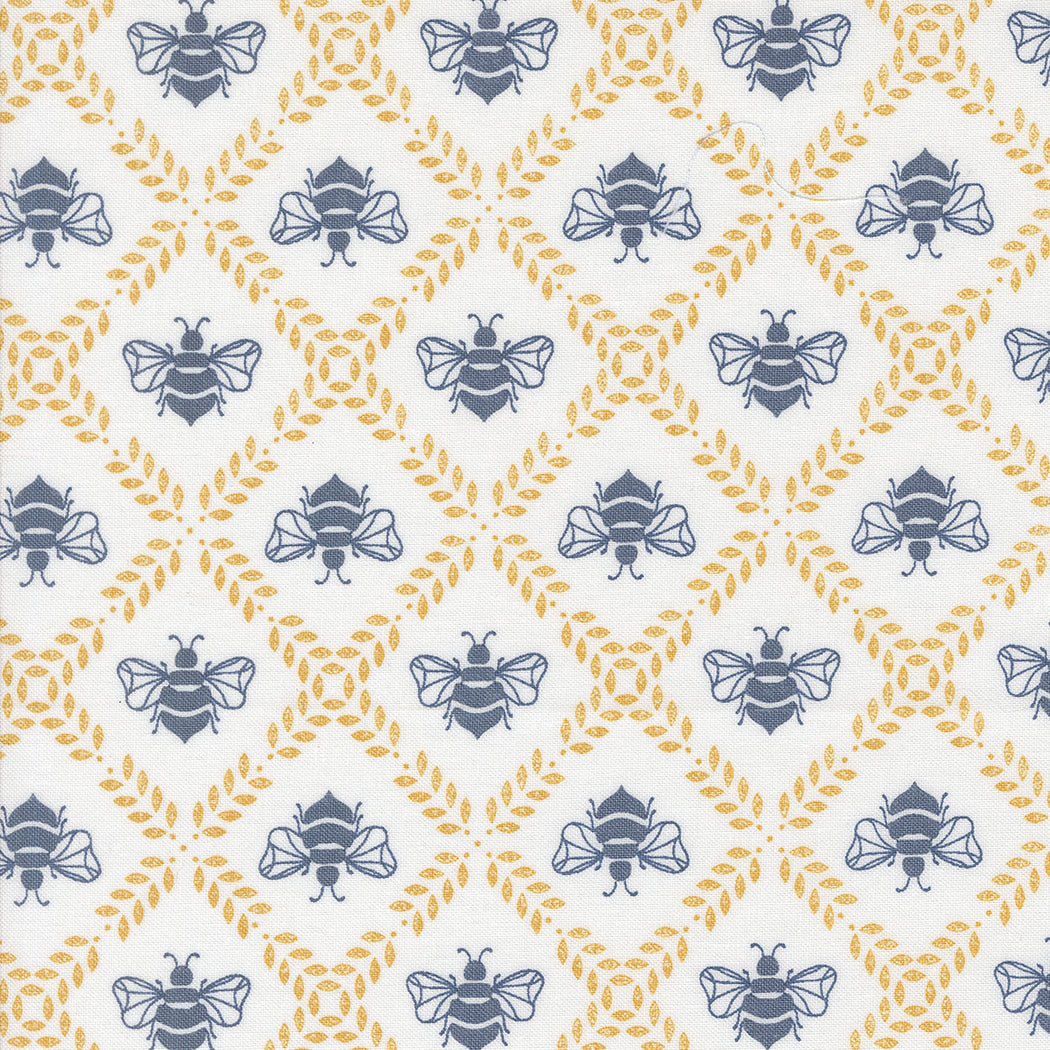 Gathering Honey novelty bees fabric in cloud white from the Sun-Drenched collection by Sweetfire Road Designs Co for Moda Fabrics.