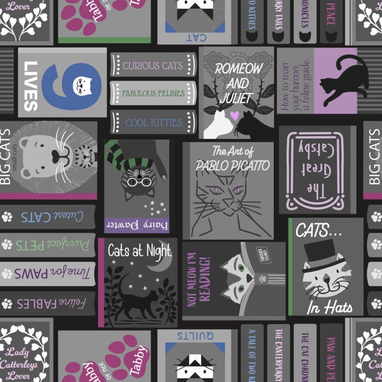 Cat Book Covers fabric on grey from The Purrfect Book Club collection from Lewis & Irene.