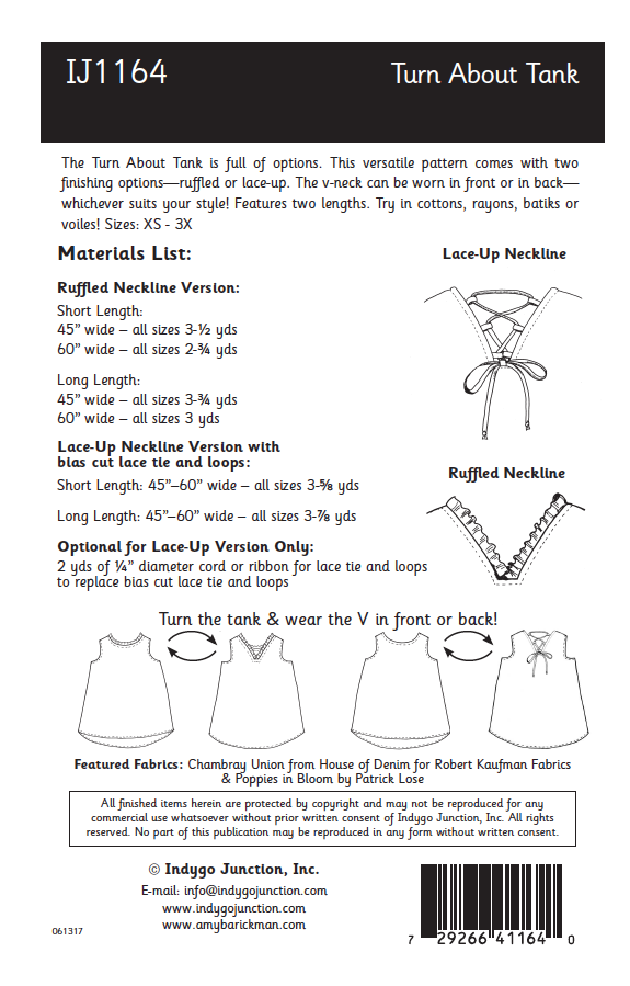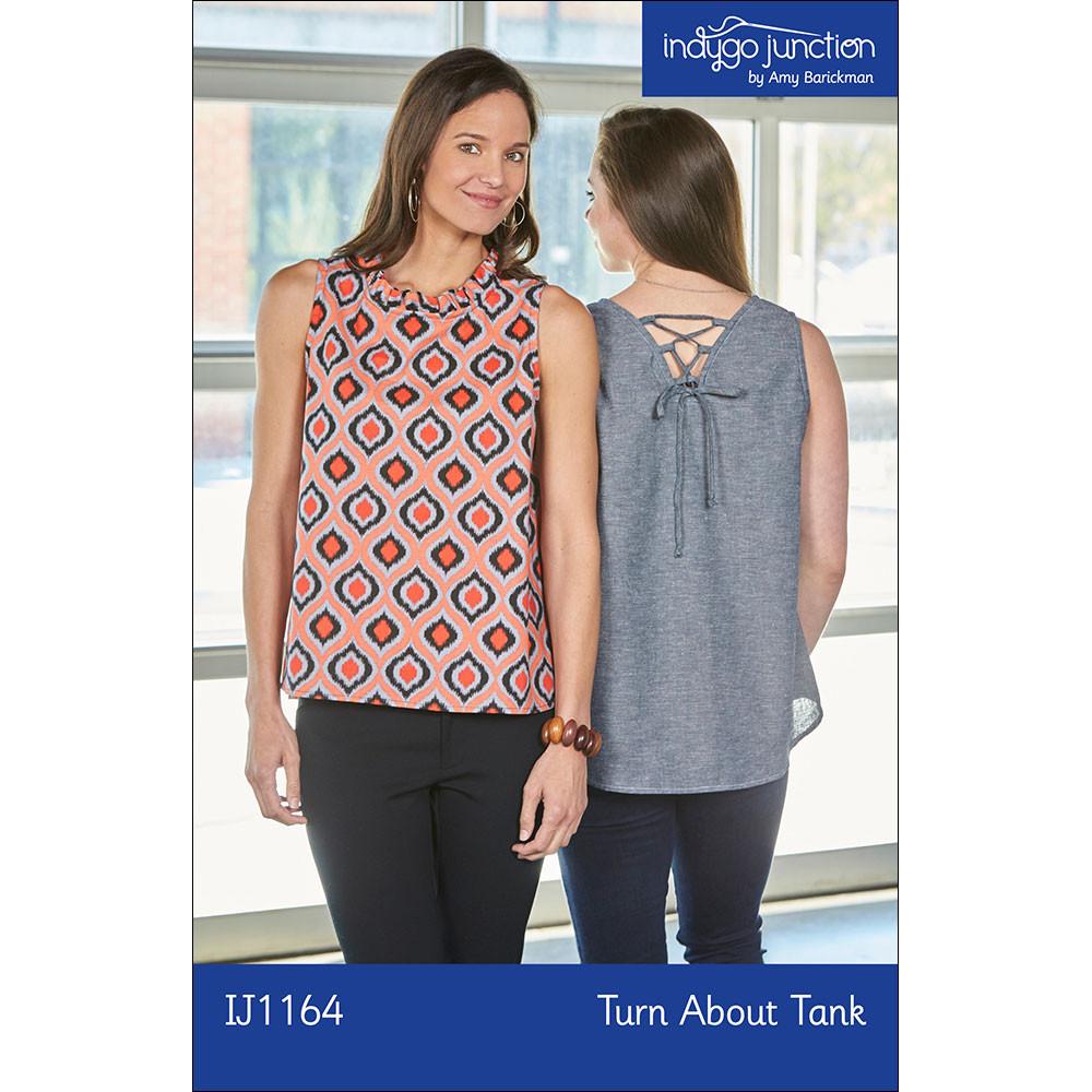 The Turn About Tank is full of options. This versatile pattern comes with two finishing options—ruffled or lace-up. The v-neck can be worn in front or in back—whichever suits your style! Features two lengths.
