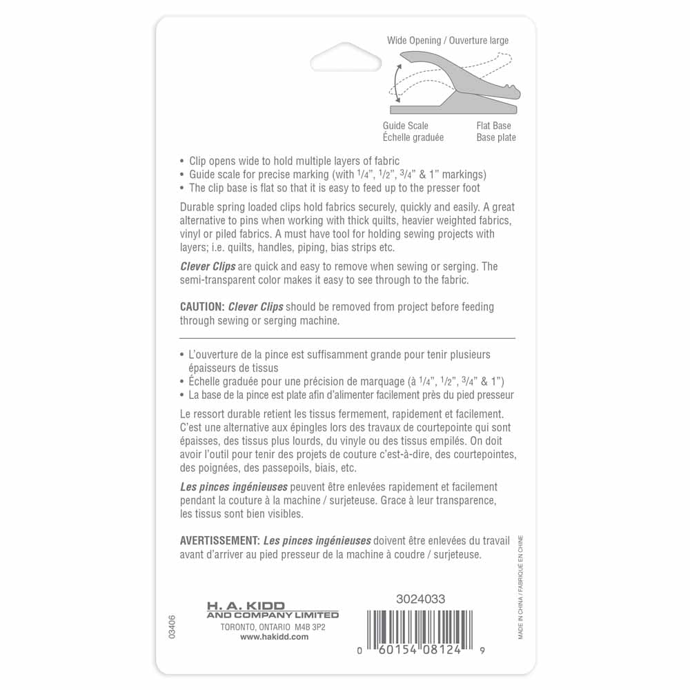 Durable spring loaded clips hold fabrics securely, quickly and easily. A great alternative to pins when working with thick quilts, heavier weighted fabrics, vinyl or piled fabrics. A must have tool for holding sewing projects with layers; i.e. quilts, handles, piping, bias strips, etc. Clips are quick and easy to remove when sewing or serging. The semi-transparent colour makes it easy to see through to the fabric.